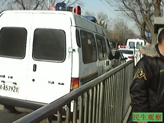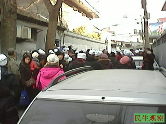民生观察工作室2014-1-13消息:今天中午北京市朝阳区常营回族乡的三百多位失地农民在中央组织部办公厅信访办(西单北大街小酱坊胡同甲31号)上访,因为时间较早,信访办还没上班,他们都在胡同口静静等待。数十名警察和便衣围着他们走来走去,刚到上班时间这些人就涌向了信访办,警察和便衣全跟了过去,开始阻止和挥手制止路人拍照。