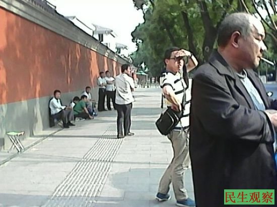 民生观察工作室2014-5-17消息:近日各地接访人员不断增多,今天有访民发现在位于中南海西侧大墙外的14路公交站点力学胡同站附近马路两侧也有不少接访人员值班,拦截各自辖区到这的访民,只要有访民过来就有接访人员走过来询问。