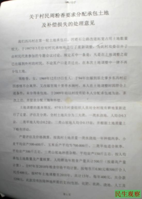 因婚姻变故一直在娘家居住的周粉香说,我虽然出嫁了,户口在娘家,我也住在娘家,我一个残疾人连地都不给我这不是要饿死我吗?多次和村里交涉没有结果后 ,周粉香开始进京上访,也因此被多次拘留、劳教。