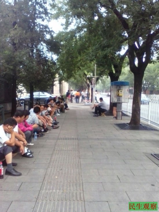 坐在公交车对面人行道上的60多个各省接访人员,或专心致志的玩手机或交头接耳的闲聊,这是这段时间来高压态势下访民“非访”数量的锐减让他们明显没有了以前的紧张。