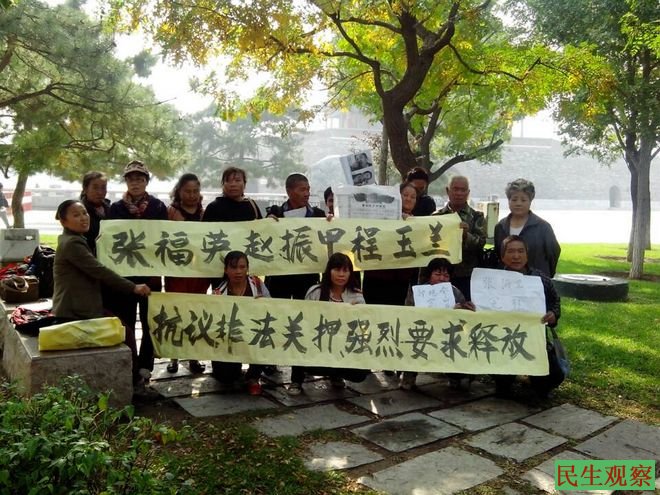 民生观察工作室2014-10-18消息:今天,在北京的林秀丽、季子燕等众多青岛访民,借中共四中全会来临之际,聚集并打出标语,要求官员不忘“良知”, 纠正访民们的冤假错案。同时,众人还声援被关押一年多的张福英等让访人。