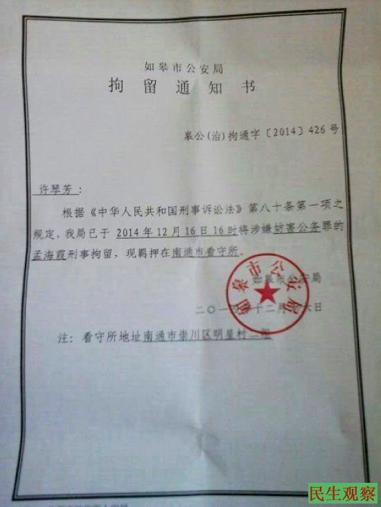 据悉,孟海霞的母亲和孟海霞的弟弟今天到如皋公安局询问孟海霞的情况,警方说他们那没有这个人,她们无奈报警求助,如皋警方才给他们打来电话,说孟海霞和她的丈夫。弟弟已被以妨碍公务罪刑拘,并给了她们家属通知书。