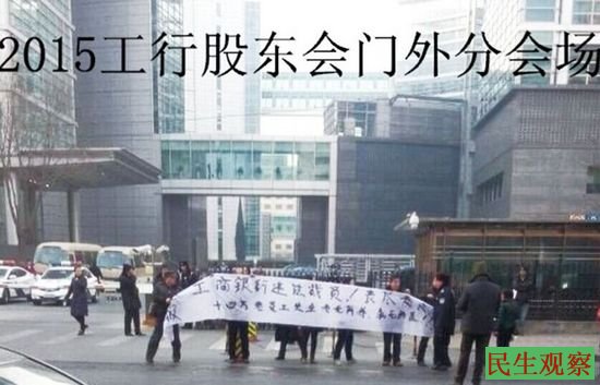 民生观察工作室2015/1/23日消息:今日,是中国工商银行召开股东大会的日子,来自全国各地45多位被买断工龄的职工代表在持有该行股票的情况下,被拒绝进入主会场参加股东大会。