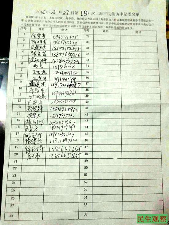 民生观察工作室2015/2/28日消息:由于上海存在许多损害群众利益、伤害群众感情的现象,并且引发了大量信访问题,而且大量信访久拖不决。2015年2月27日上午(按惯例每月底星期五),137位上海访民第十九次集体信访中纪委信访部门,控告上海地方政府不作为和乱作为的行为,提出必须着力解决发生在上海访民身边的腐败问题,对侵占上海访民利益等腐败问题开展专项治理,并立即彻底解决上海访民最关心最直接最现实的利益问题,促进社会的公平正义的信访事项。