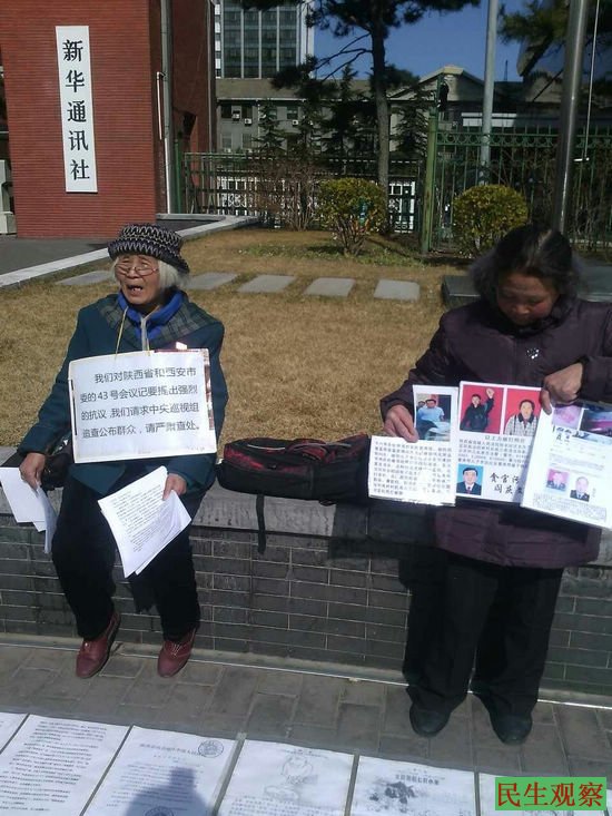 民生观察工作室2015-3-5消息:在京上访的陕西西安72岁老访民王莉萍和陕西蓝田县访民曹秀琴与昨天下午在新华社门前摆反腐漫画,被北京市西城区公安分局两名警察带走送到久敬庄关押,当晚,曹秀琴被接出遣返,王莉萍失踪。