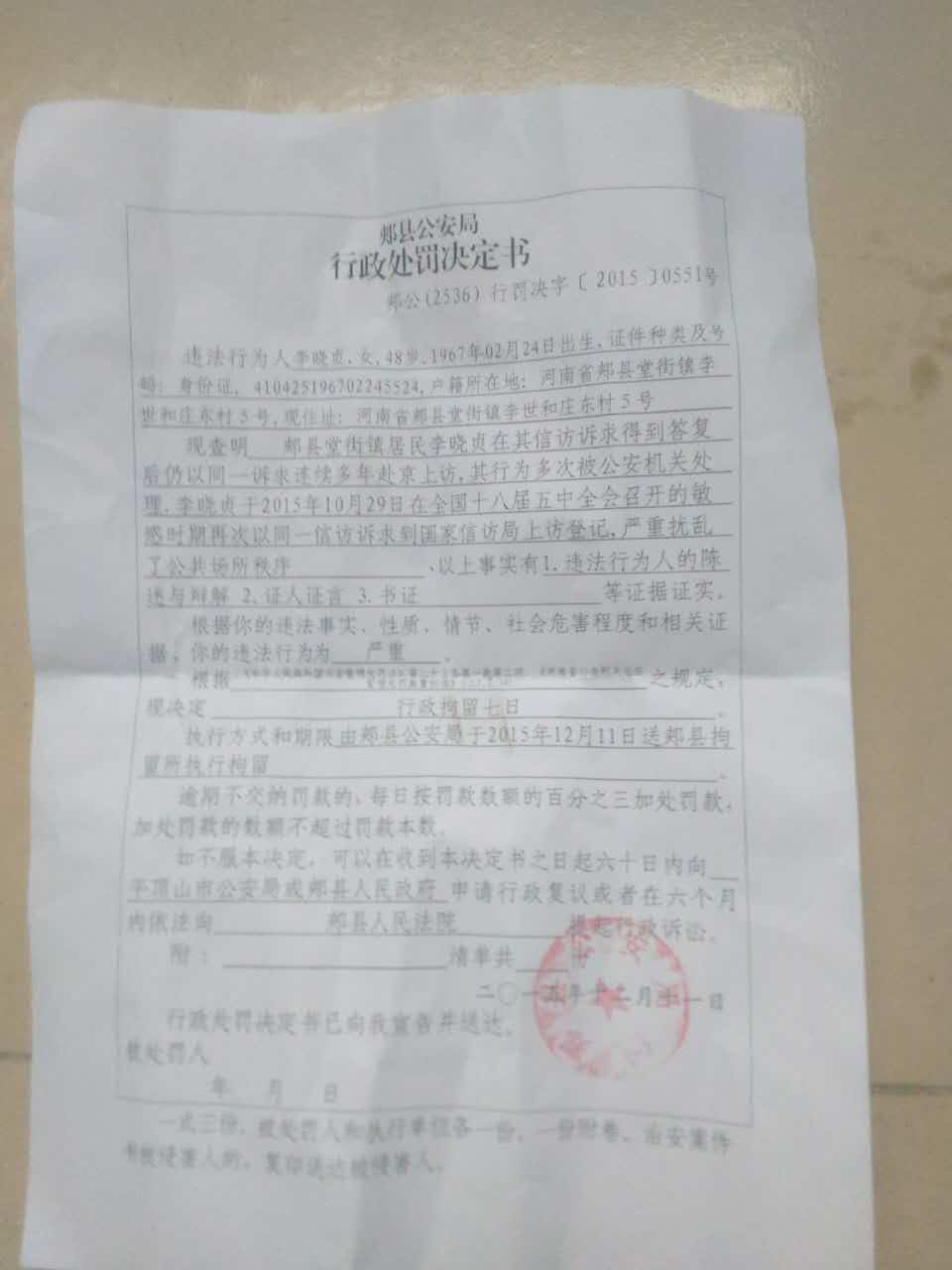 郏县公安局出具的处罚决定书中载明,李晓贞在其信访诉求得到答复后仍以同一诉求连续多年进京上访,其行为多次被公安机关处理。李晓贞于2015年10月29日在全国十八届五中全会召开的敏感时期再次以同一诉求到国家信访局上访登记,严重扰乱了公共场所秩序,根据相关规定将其拘留7日。