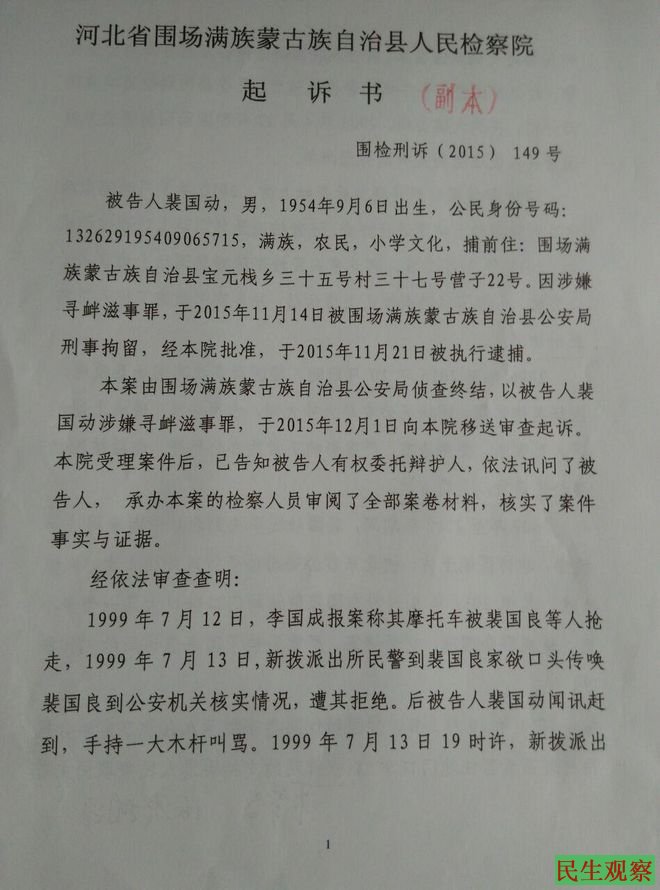 相关报道:河北承德访民裴国栋被检察院批准逮捕