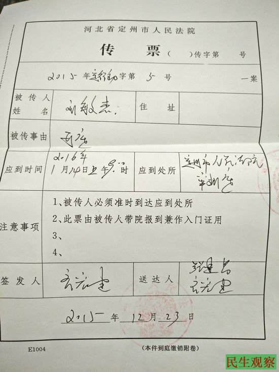 民生观察工作室2016/1/16消息:河北定州市子位镇访民刘敏杰,诉定州市公安局非法拘留、不予发放解除拘留证明书和子位镇政府胡乱作为非法限制其自由并移交公安机关等案件,1月14、15日连续两天在定州市法院开庭审理。