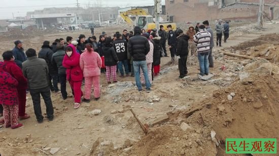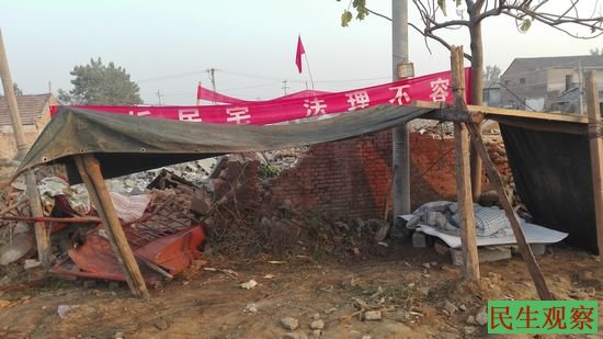 解立新说,2015年10月17号下午,在我家里没有人的情况下,大队书记赵金花带领一群人还有挖掘机,前后不过十几分钟就把我家夷为平地,家中财产被毁于废墟之中。后来我家就在废墟上打上了窝棚,拉上了“强拆民房,法理不容”等横幅,继续抗争。在这期间,他们多次到我家骚扰,用挖掘机铲平我家废墟,我家不同意多次打110报警,警察不来。