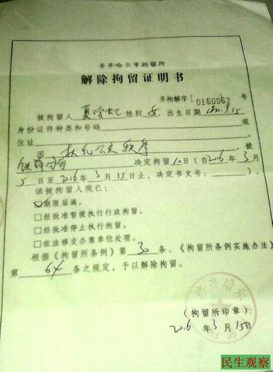 民生观察工作室2016/3/15消息:黑龙江齐齐哈尔市访民夏学虹,因两会期间乘车进京,3月5日被齐齐哈尔市公安局铁峰分局以扰乱公共秩序为由将其拘留10天,于今日获释。