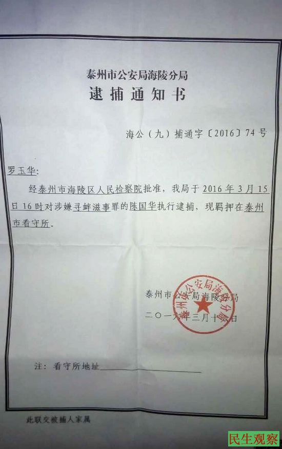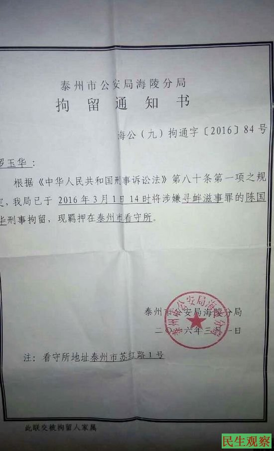 陈国华的妹妹说,陈国华是2016年2月29日17时被泰州海陵分局和九龙派出所朱华所长的人从庙会上带走讯问。3月1日被泰州市海陵公安分局刑事拘留,九龙派出所姜涛副所长说我姐去北京上访闯禁区犯法了,还说“这是上面的指示,我们也没办法”。