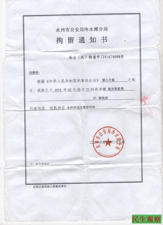 湖南永州市访民熊艳丽被以敲诈勒索为由监视居住 |