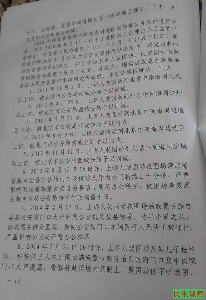 据悉,1999年7月,裴国栋被围场蒙古族自治县公安局新拔派出所警察开枪打伤。事发后裴国栋多次上访讨说法,要求查处警察滥用职权、违法使用枪支。2004年裴国栋被以 “妨害公务罪”遭判处两年有期徒刑。
