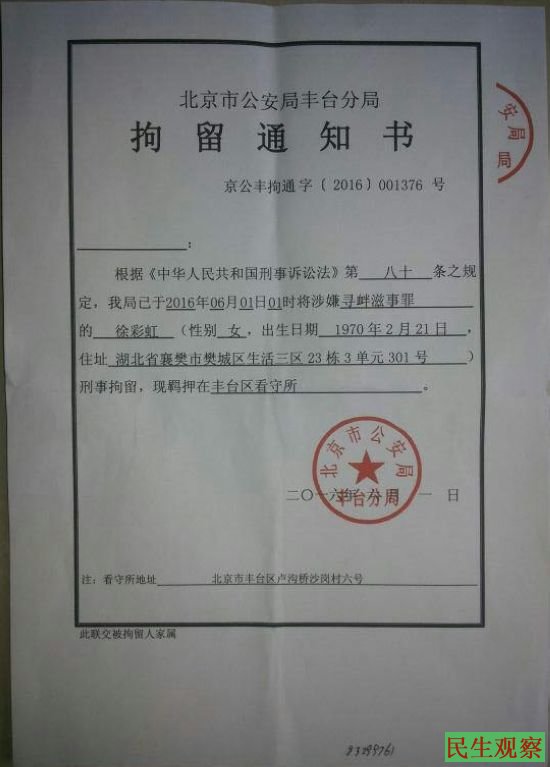 另外,昨天被北京大栅栏派出所抓走的湖北维权人士徐彩虹,今天被北京市公安局丰台分局以寻衅滋事罪刑拘,羁押在丰台看守所。