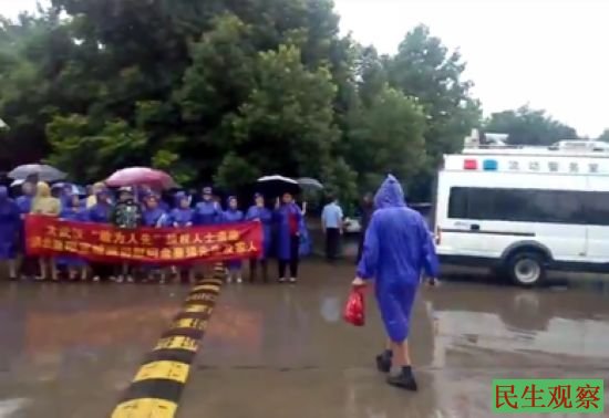 民生观察工作室2016/6/24消息:今天是湖北省宜城市市长和市委书记接待日,上午,湖北宜昌市访民余善强和30余来自全国各地的访民冒雨来到宜城市政府门前拉着横幅高喊“还我公道”,其中李来用、何玉莲、何玲3人被抓走拘留,拘留期限是7天。