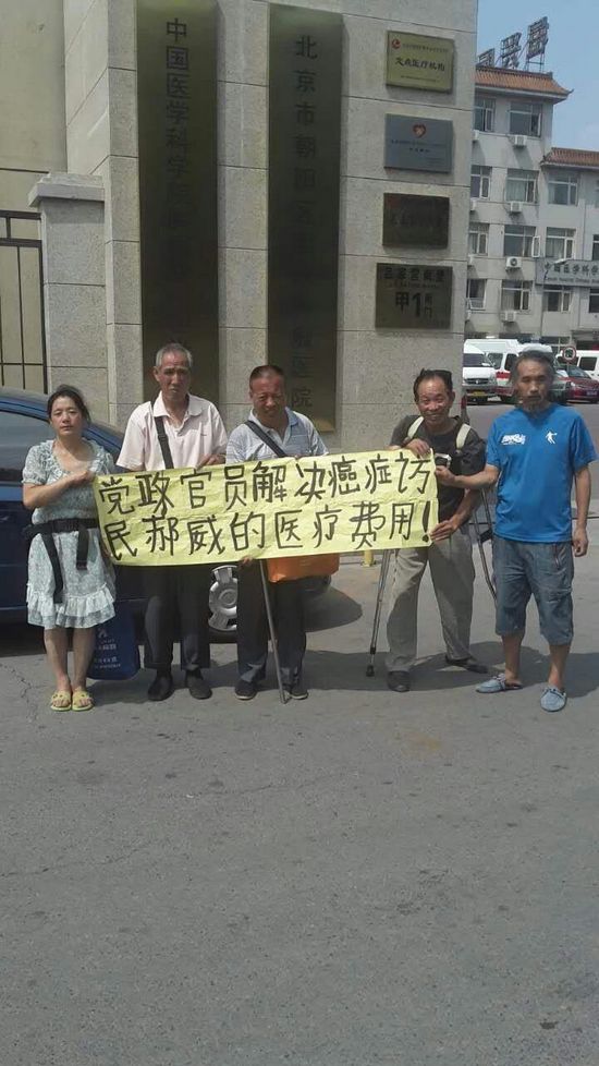 此外,在京访民吴继新、盛兰福、侯敏玲、刘聚财、杨宗生等人今天到中国医学科学院肿瘤医院恒兴医院看望癌症访民郝威,并张打横幅呼吁党政官员解决马三家受害者郝威的医疗费,得到路人的捐助。