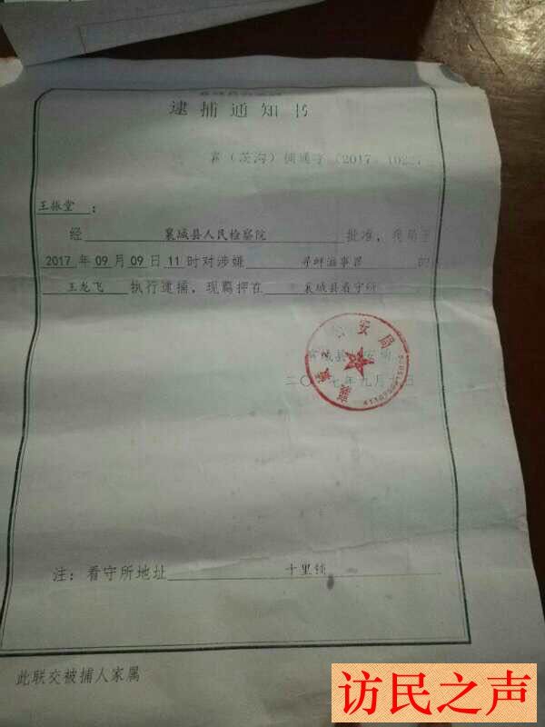 8月2日一群警察闯进我家,不由分说把我儿子王龙飞带走关押在襄城县看守所,并带走了家里两个手机和亲戚家的一台电脑。当时王龙飞的母亲张大娥不在家,8月3日,又把张大娥三个帮忙维权的姐姐带走拘留了五天。8月12日,张大娥在厦门被带回来关押在拘留所,后又被送到许昌看守所。昨天9月9日乡派出所送来逮捕证,张大娥、王龙飞以寻衅滋事罪被逮捕了。