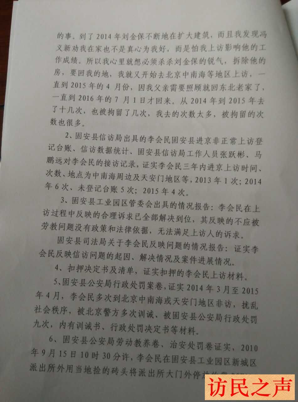 在今年5月9日案件开庭审理期间,固安县法院查明,李会民“违法上访”的截止时间是2015年4月,因其2009年至2015年间未能以正确方式、通过正常渠道表达诉求,而是非正常进京上访,被多次劳教和训诫及行政处罚后仍不改正,其行为严重扰乱了社会管理秩序,已构成寻衅滋事罪,故判处其有期徒刑一年五个月。