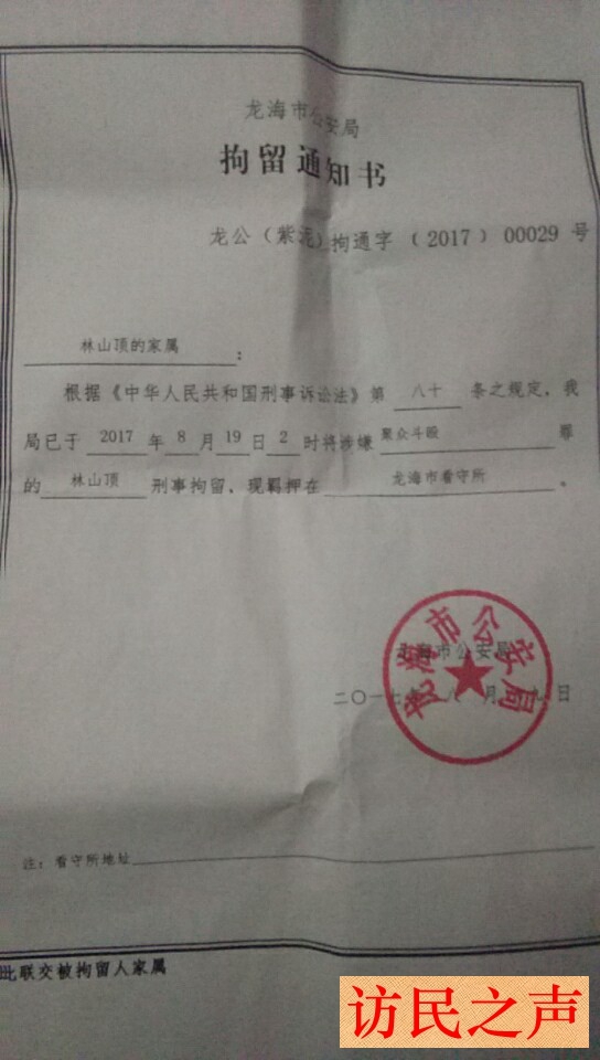 [访民之声2017/9/18消息] 福建省龙海市林山顶、詹月娇夫妇因邻里斗殴不满警方处理结果上访3年。今年的8月18日,包括林山顶夫妇在内的一家6口人被警方带走刑拘,至今有4人关押未放。