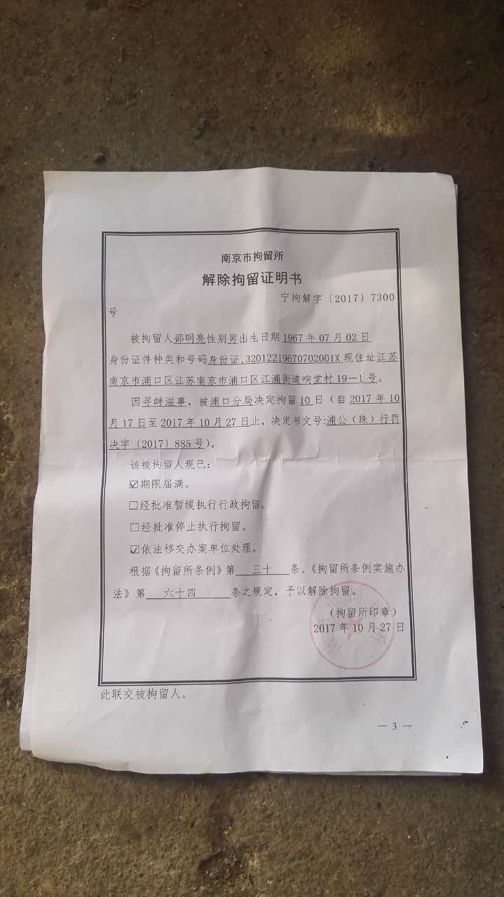 据悉,2017年10月17日上午10月点多,南京市公安局、浦口分局、珠江派出所等出动20余人手持盾牌和警用武器,气势汹汹的来到南京响堂村邵明亮家,撞击破门而入,将已经就寝休息的南京异议人士绍明亮抓走。由于长期被迫害软禁而健康不佳,邵明亮当天因身体不适而卧床休息,但大批破门而入的警察,还是将坐轮椅的绍明亮强行带走,随后以涉嫌“寻衅滋事罪”将其拘留。