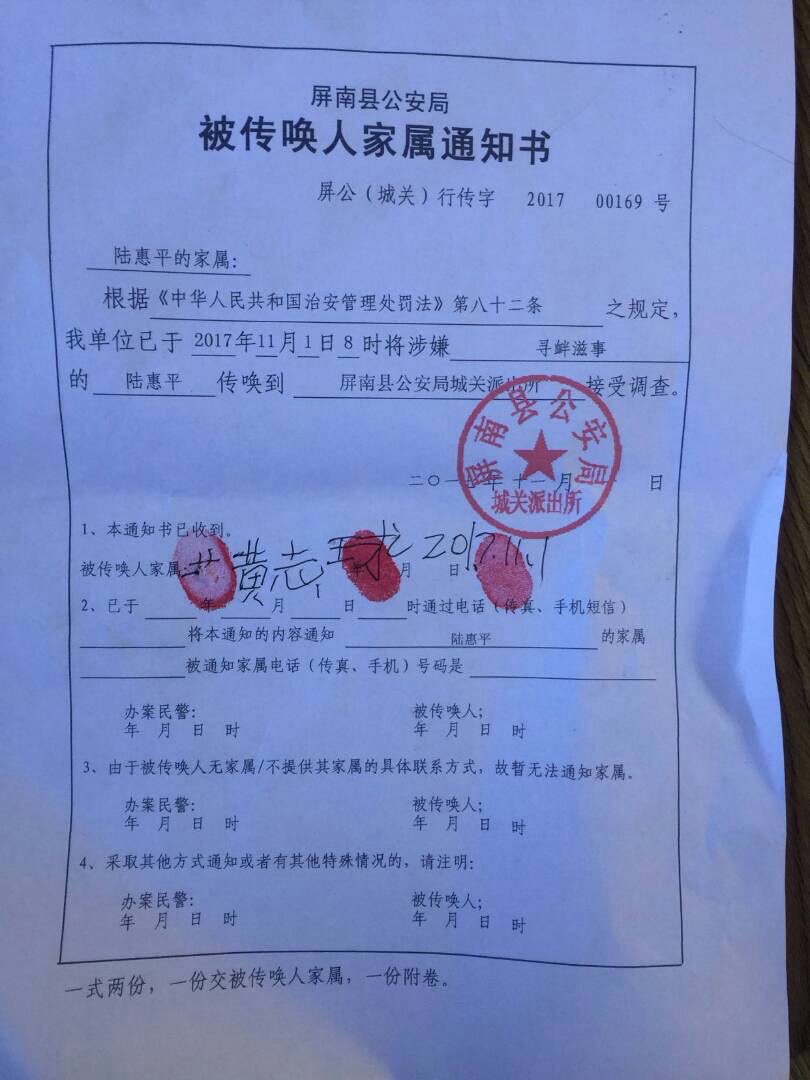 据悉,陆惠平之前因为当地政府强征强拆她家赖以生存的耕地,为了维护自身受侵害的合法权益,多次将当地政府告上法院。屏南县公安局局长黄文挺竟荒唐地违法介入征地拆迁纠纷中,无端将黄志球、陆惠平母女列为管控对象,多次滥权威胁和报复打压,随意乱非法拘禁。目前,黄志球已收到屏南县公安局城关派出所抓捕(传唤)陆惠平的通知书,上书理由是涉嫌“寻衅滋事”,现陆惠平的手机已经无法联络。