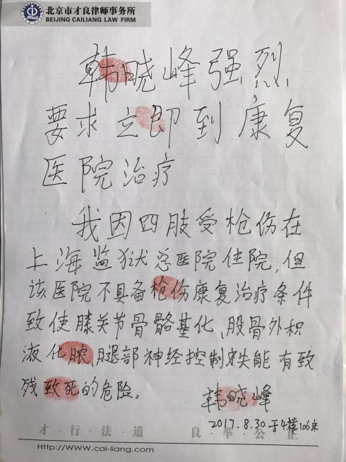 但2017年8月31日,辩护人再次会见韩晓峰时发现韩晓峰的病情明显恶化,右大腿伤口感染较为严重,会见过程中伤口一直在流浓。辩护人紧急约见上海市监狱总医院外科主任、主治医生和医院院长,医院院长坦诚告知上海市监狱总医院确实不具备枪伤康复治疗条件,建议向静安公安分局请求办理转院治疗事宜。辩护人立即将韩晓峰手书请求安排转院治疗的申请书当面递交给静安公安分局的民警,接收申请书的民警称将向领导报告后给辩护人答复。但迄今,静安公安分局未向辩护人作出答复。