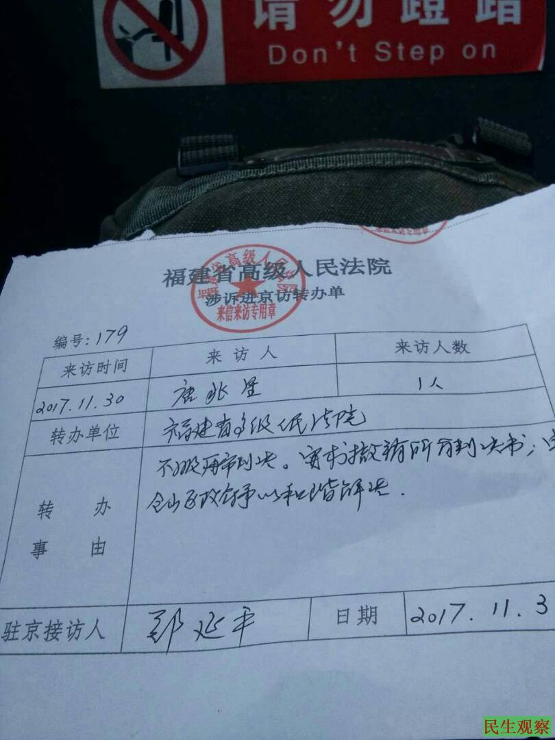唐兆星还留言说,他会于今天下午通过北京到福州的火车被遣返,明天(2017年12月2日)回到福州。唐兆星气愤地表示,按福州市公安局仓山分局往常惯例,处理(迫害)凡进京上访被遣送回来的访民,都是不问青红皂白一律先行行政拘留10天。