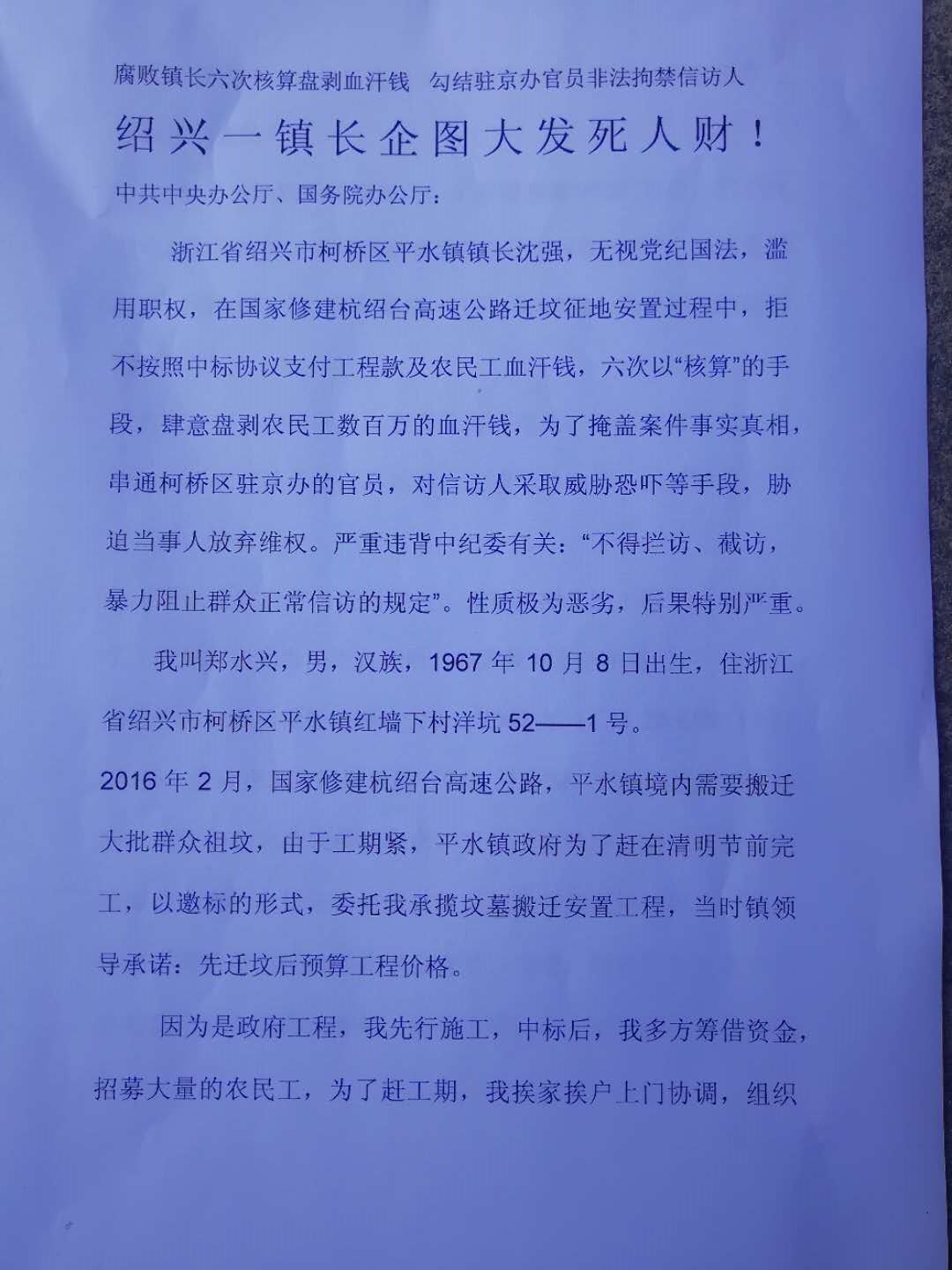 近一年来,他一直不断地向所在地的浙江省有关部门申诉,但平水镇政府领导却无视上级领导的批示,阳奉阴违,不予理睬。万般无奈,他只得进京上访维权。2017年11月22日,他抵达了北京并入住在北京建国饭店准备次日上访。但在当晚11:25时许,绍兴驻京办遭截人员就邀请北京天桥派出所警察,把郑水兴从“建国饭店”带进了派出所。随即,绍兴市驻京办截访人员就来到天桥派出所,把郑水兴接出来,准备把他送到“北京久敬庄接济服务中心”,但郑水兴坚决反抗。于是遭截人员就把他带到了北京“天坛饭店”,并且搜走了他的身份证及信访材料,开始了对他的非法拘禁。之后又被截访人员强行绑架回浙江绍兴的家中看管,目前他已经无法自由出行到北京去上访维权了。