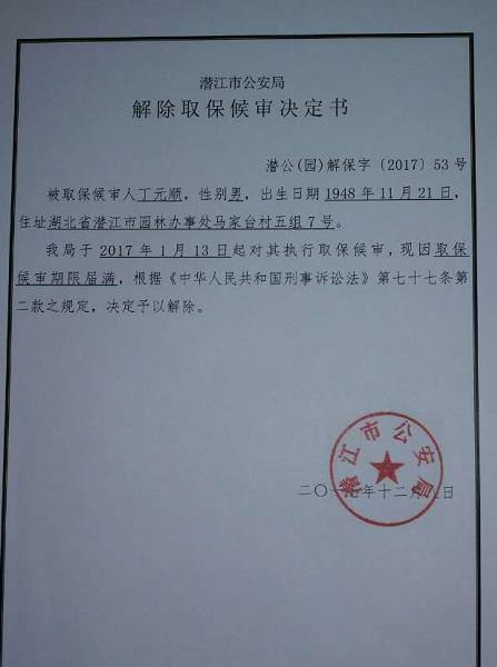 据悉,湖北潜江在2016年市级人大选举中,有大批独立参选人遭到来自当局的打压。其中比较典型的例子便是彭峰,他因独立参选于2016年12月16日,被以涉嫌“敲诈勒索罪”批捕,至今依然被关押在看守所,后来检察院以涉嫌“寻衅滋事罪”起诉到法院,但至今没有开庭。此外,独立参选的公民丁元顺,万小云都被以涉嫌“寻衅滋事罪”抓铺。丁元顺在关押30后取保候审,而万小云则被关押到2017年2月26日后取保候审。丁元顺在207年12月8日收到湖北潜江公安局《撤销案件通知书》和《解除取保候审决定书》,丁元顺的妻子当时做了担保人,也同样收到了《解除取保候审通知书》,同时也取消了“担保责任”。同样是独立参选人的万小云却在2017年12月12日收到了《移送起诉告知书》,案件已被送往潜江市人民检察院起诉。