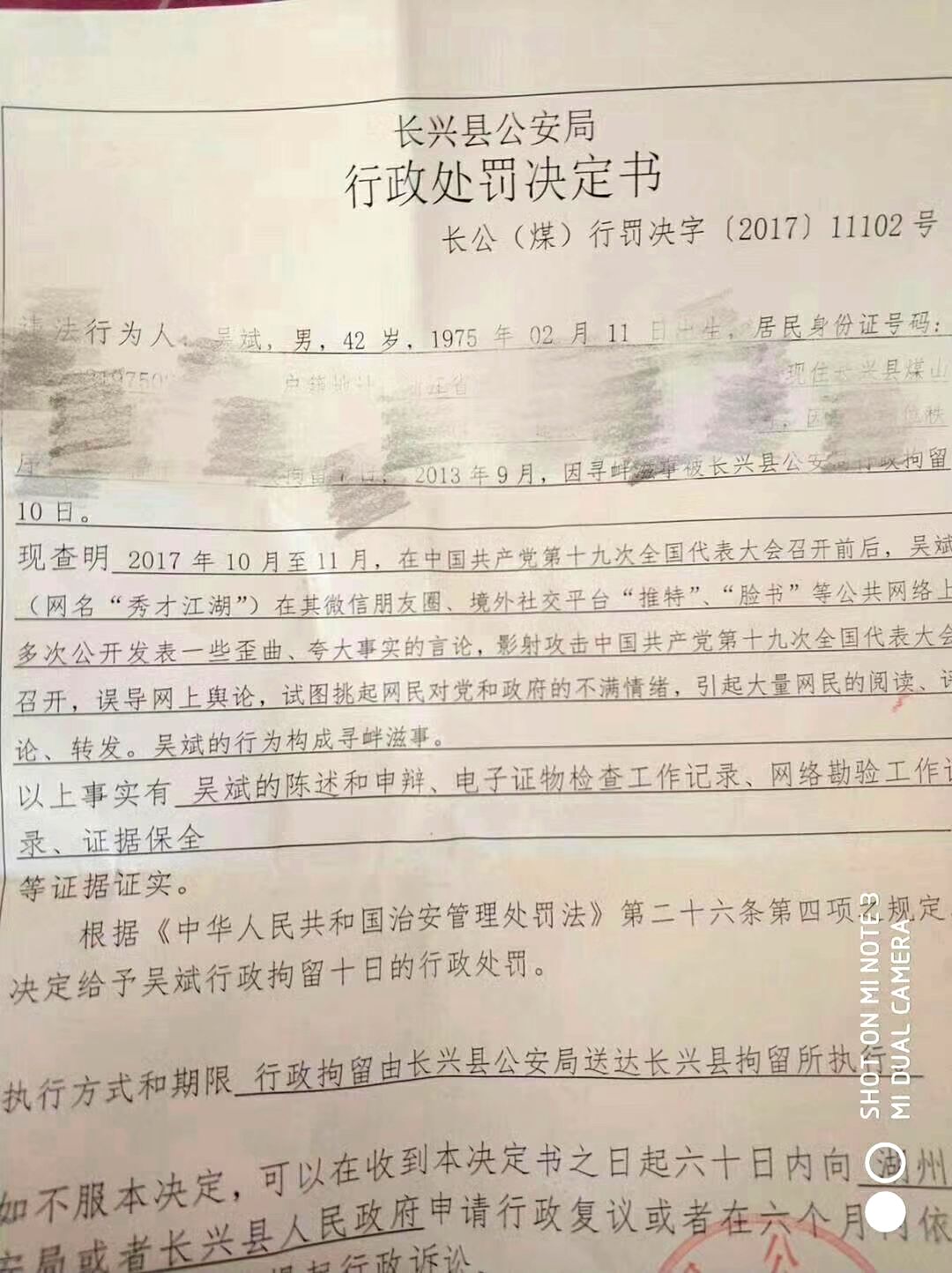 2017年12月12日,“秀才江湖”的前妻黄美娟在微信发帖称,下午她正在打吊水时,接到“秀才江湖”吴斌妈妈的电话,说吴斌被浙江湖州市长兴县煤山派出所抓走,然后以他“十九大”期间在网上发表不当言论为由,处以行政拘留十天,现已送去长兴县看守所执行拘留。
