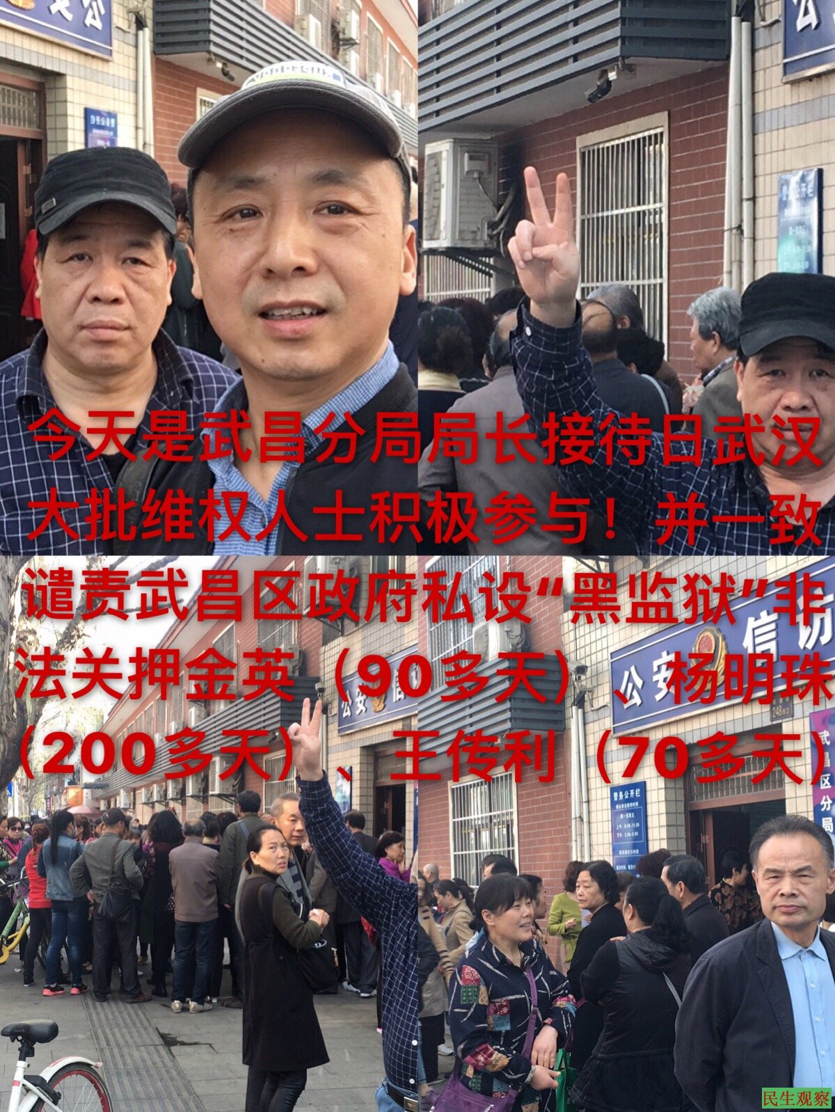 【民生观察2018年3月28日消息】本网获悉,今天是湖北武汉市公安局武昌分局局长信访接待日,同时也是武汉市硚口区信访局长接待日。今天,数十位武汉访民来到接待现场,当面向公安/信访局局长反映被侵权问题,及武汉维稳部门私设黑监狱的问题。