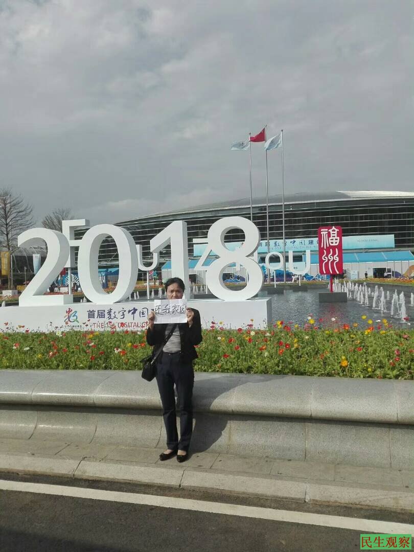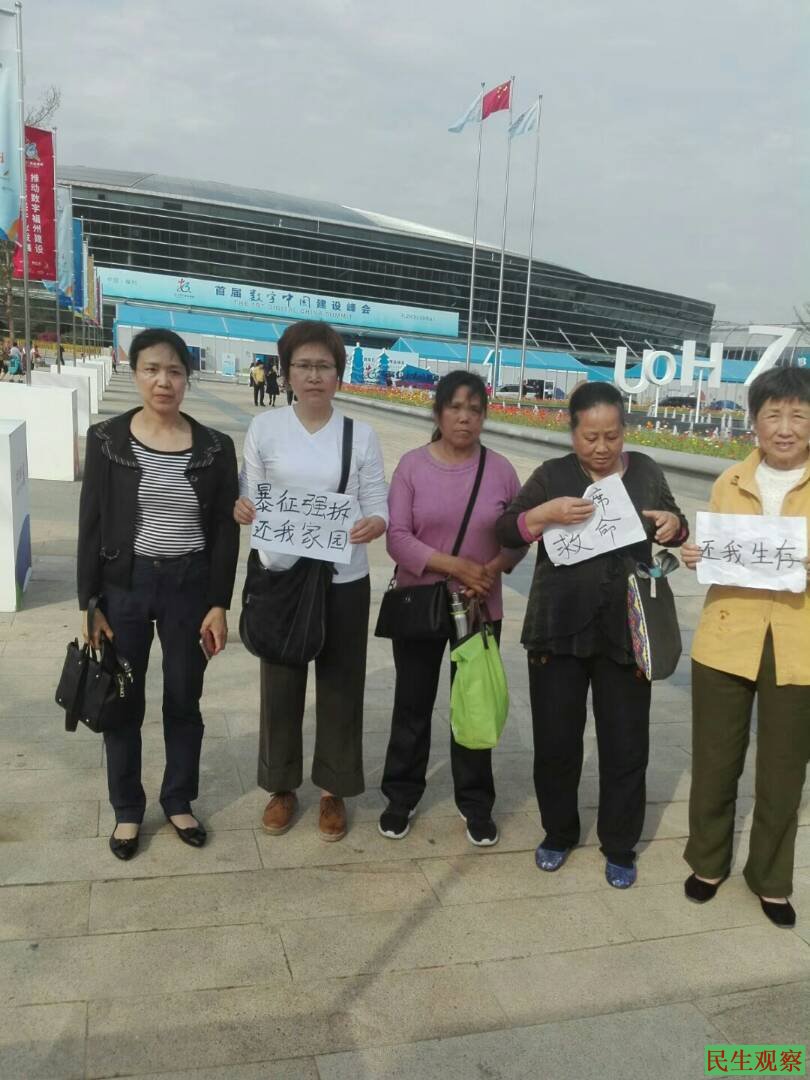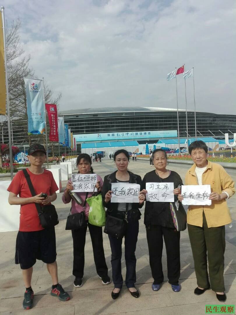 【民生观察2018年4月22日消息】昨天(2018年4月21日)下午,福州陈气、谢小珍、李良玉、张华、李妹妹、罗丽萍、叶钟、邱香平、林赛英、梁百端、林晓红等十几个冤民再到位于福州仓山区国际会展中心的首届“数字中国”建设峰会现场举牌展示冤情。他们的诉冤活动,遭到预先守候的当地街道及社区官员和保安的拦截,甚至暴力绑架。