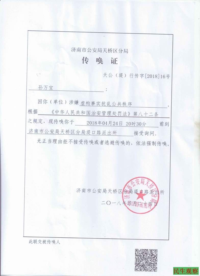 【民生观察2018年4月25日消息】民生观察2018年4月25日消息:本网获悉,昨晚(4月24日),山东知名通讯维权人士孙万宝(网名:南极次大陆)因在新浪微博转发“警察逼迫一最底层百姓下跪抱头”的视频(链接:https://twitter.com/4jzim2gyfozadho/status/988439677052096512?s=12)而遭山东济南堤口路派出所传唤。