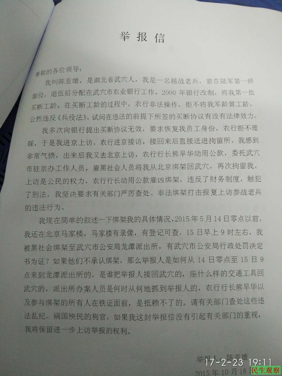 民生观察2018年4月28日消息;2018年4月28号陈亚雄获得释放。他是一个退伍军人转业分配在银行工作,在银行改制减员中被逼无奈买断下岗,多次参加银行维权活动,多次被银行截访的公安与银行工作人员接回当地,多次被关押拘留与在2015年被当地关押了一年多被无罪释放后再次到北京上访。