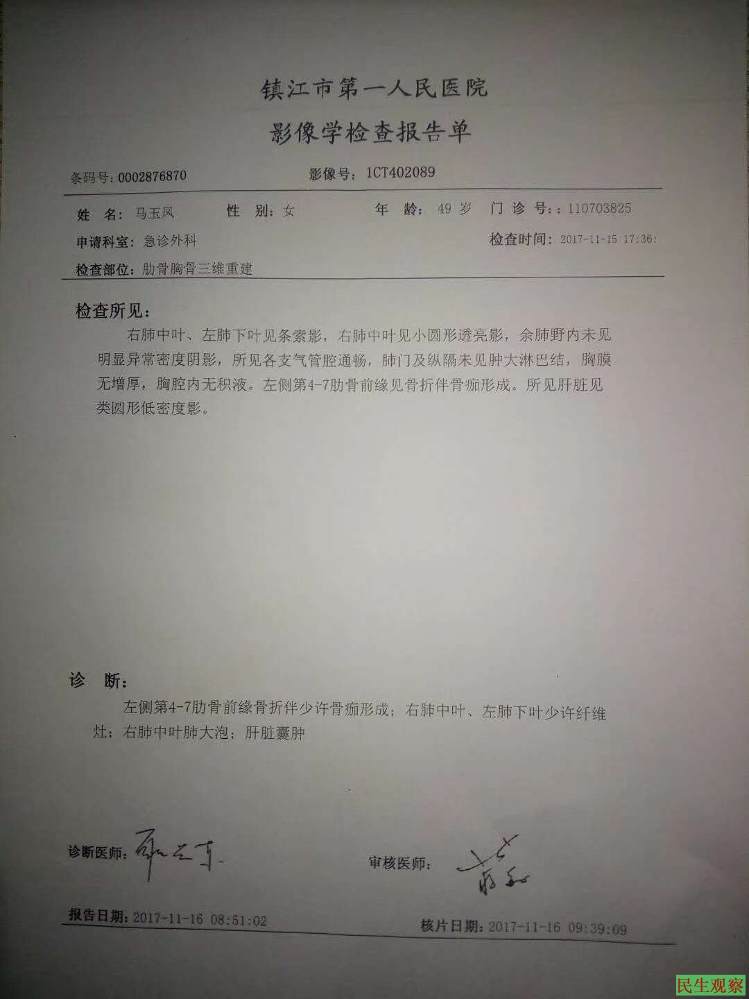 在医院治疗期间,她仍然被24小时监视,这些人一天三班,每班有七八个人,连病房门都不她出。气愤无奈之下,她的家人报警要求抓捕打人凶手,而润州分局警察则要她先做伤情鉴定,后鉴定报告下来经家属多次要求才给立案,立案后警察却不抓捕打人凶手,至今未对受害者进行赔偿。此次共住院治疗28天,医疗费用过万,都是她自己承担。
