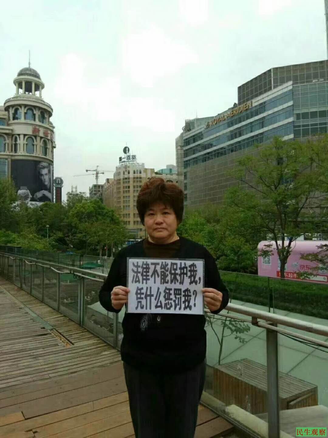【民生观察2018年5月7日消息】本网获悉,上海长宁区维权公民尹慧敏在2018年全国两会期间被截访关押31天,2018年4月27日她又上街举牌呼吁“依法治国,请给我一个诉理的地方”。2018年5月1日,她被上海警方抓进上海华阳派出所地下室关押,获释后她又被警方派出的“特保”人员跟踪监视。