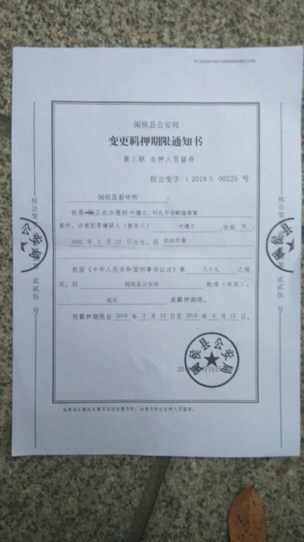 据悉,叶孔平于2018年3月9日一个人在北京长安街上行走,当路过西单附近时,遇到警察对路人检查身份证。只因为叶孔平是访民,警察就把他带到派出所,后被遣返回福州闽侯县。没想到3月13日,叶孔平莫名其妙被闽侯县公安局以涉嫌团伙“寻衅滋事”罪名送到闽侯县看守所关押,但他本人未收到有关刑事拘留决定书,只是到看守所才收到闽侯县公安局于2018年3月15日签发的《变更羁押期限通知书》侯公变字(2018)00225号,羁押期限为3月13日至4月12日。枉法羁押一个月期满释放后,于4月29日又被闽侯县公安局以荒唐的所谓“未遵守监管”为由行政拘留10天。