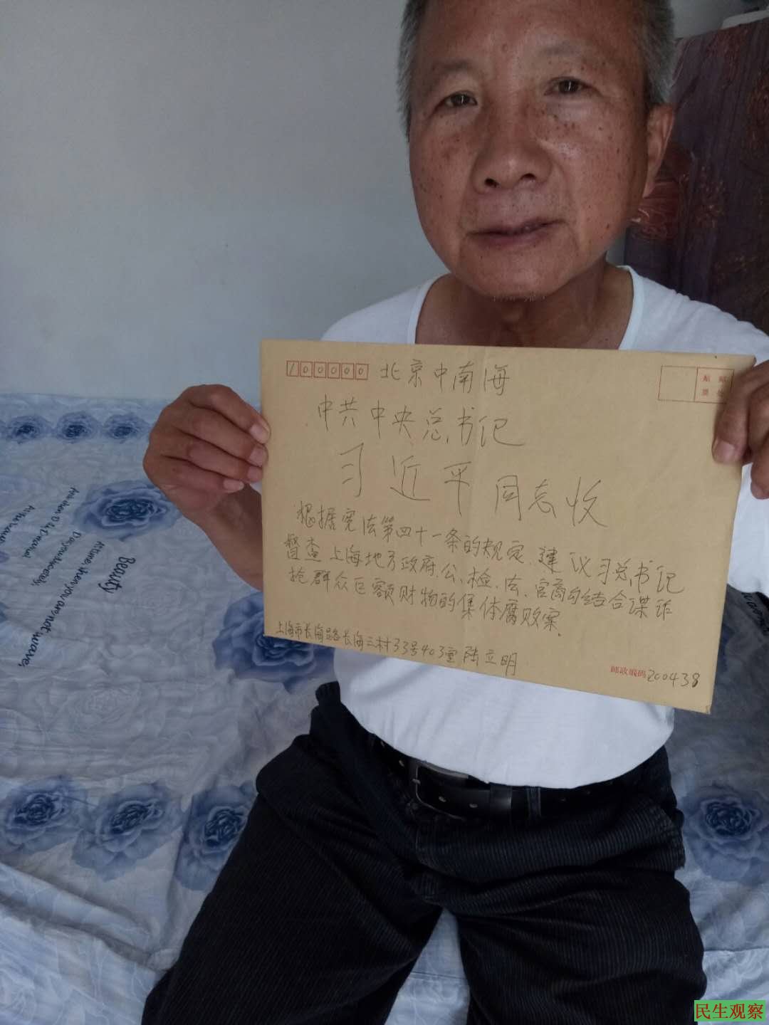 【民生观察2018年6月2日消息】本网获悉,昨天上海杨浦区访民陆立明去中南海给习近平书记寄信,被北京警察带到警所后由上海驻京办接出,今天被押送回上海,目前被非法拘禁在家中,出门被贴身跟踪。