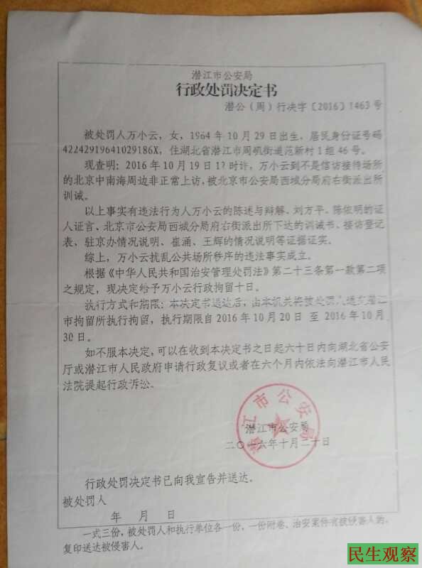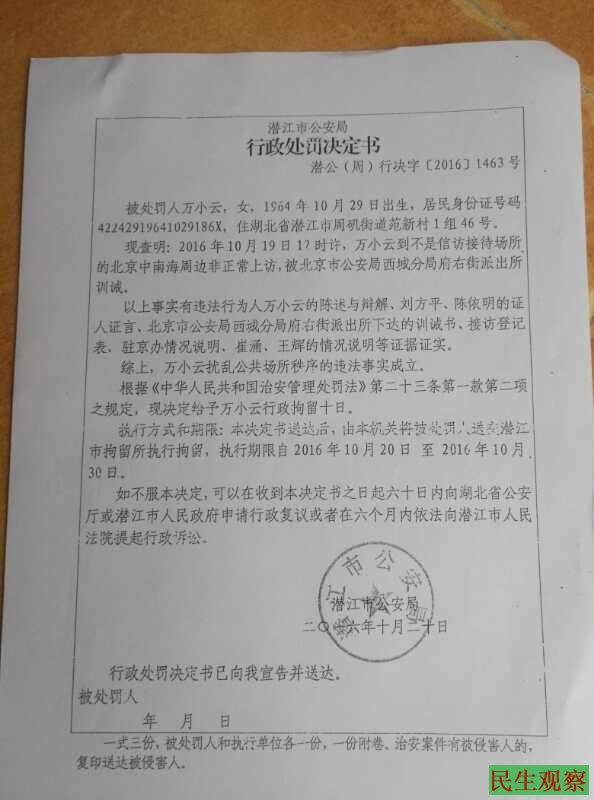 知情人士:“万小云在维权过程中在2016年1月5日,2016年4月13日,2016年5月18日,2016年10月19日,2016年11月22日,以上是分别拘留10天,7天不等,2016年12月8日行政拘留10天后转为刑事拘留,在刑事拘留期满后以涉嫌寻衅滋事罪逮铺。由于万小云身体原因两个月后取保候审释放回家,在万小云取保候审一年即将到期时,湖北潜江公安局再次将万小云案件送检察院起诉,万小云一个计划生育手术失败的受害者却遭到如此的打击报复,精神是受到双重打击伤害,万小云说;在检察院没有给任何手续,检察院要她签字,她拒绝签字所以检察院没有给她出具任何手续,万小云说;她目前是村里一个不相干的一个人担保再次给予了取保候审,潜江公安局检察院,法院等相关机构就是如此违法打击报复参加选举的万小云的”。
