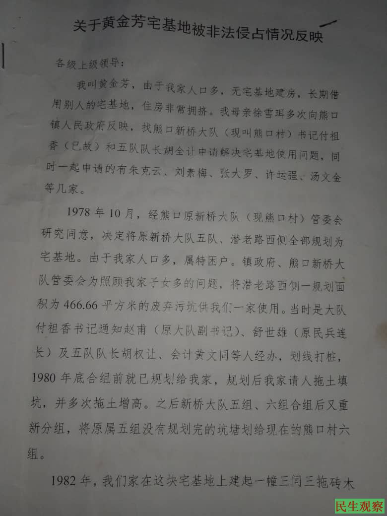 在1987年10月,经过熊口镇原新桥大队,(现在的熊口村),管理委员会研究决定同意,由于我家上上下下几代人人在一起租借别人的住房,家里人多,属于特困户,镇政府熊口新桥大队委员会为照顾家里人口多的问题,将一处废弃污染泥坑供黄金芳一家使用,面积为466,66平方米,当时是由各级领导,乡镇领导,大队副书记,民兵连长,以及大队队长,对会计等人员一起经办,划线打桩,规划为此宅基黄金芳家地使用,这些经办人员是原书记付祖香,副书记赵莆,民兵连长舒世雄,大队长胡权让,会记黄文同等人。