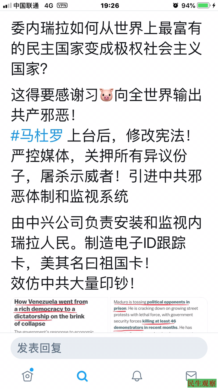 据悉,注册推特账号已有五年之久的西安网友赵卫东在春节前的1月29日(年廿四)遭到西安市公安局阎良分局胜利路派出所的传唤,警方指赵先生利用推特账号在1月2转发一条海外网友发布的“虚假消息”,推文内容为:“委内瑞拉如何从世界上最富有的民主国家变成极权社会主义国家?这得要感谢习向全世界输出共产邪恶!马杜罗上台后,修改宪法!严控媒体,关押所有异议分子,屠杀示威者!引进中共邪恶体制和监视系统。由中兴公司负责安装和监控委内瑞拉人民。制造电子ID跟踪卡,美其名曰祖国卡!效仿中共大量印钞!”