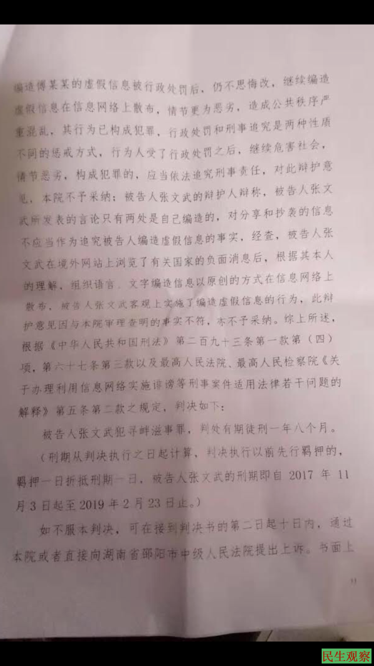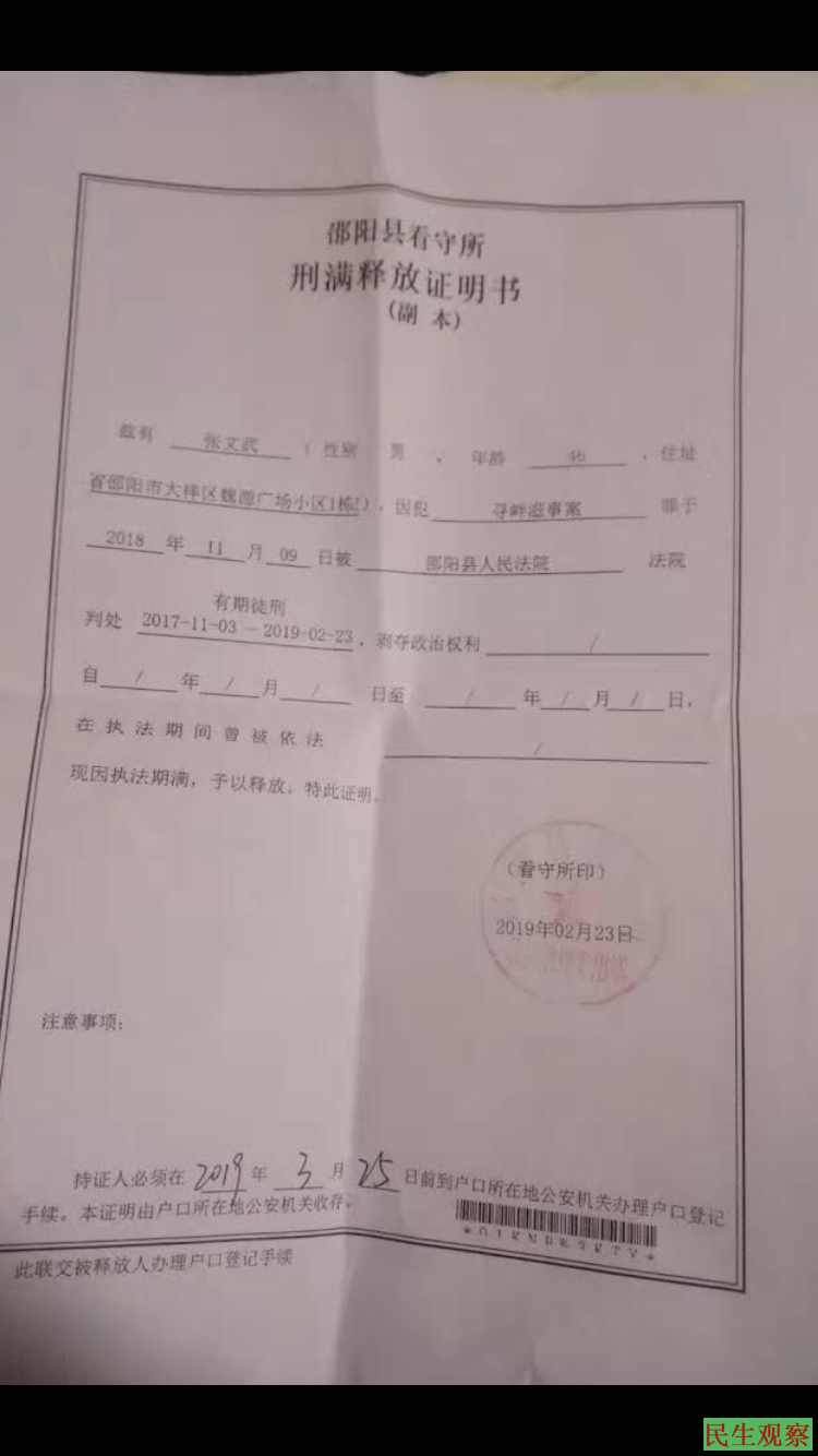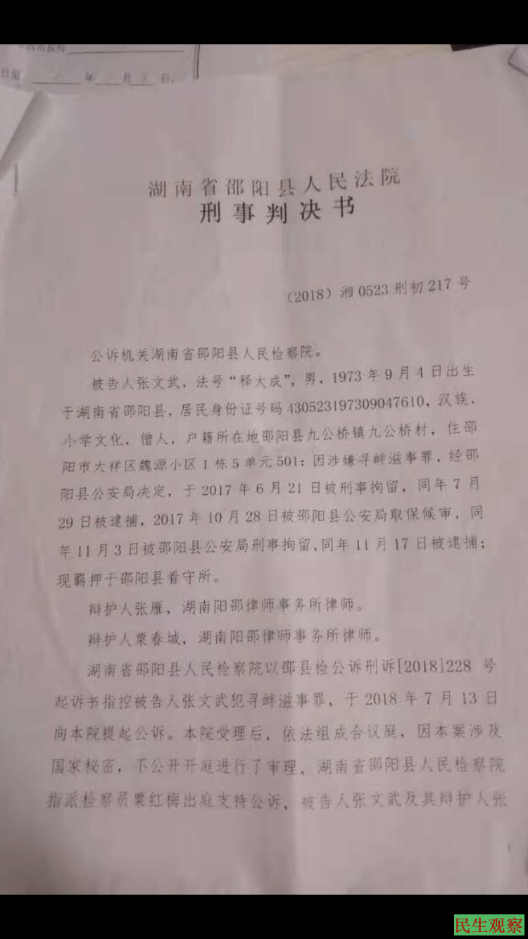 【民生观察2019年2月23日消息】曾因网上发帖而被控”寻衅滋事”刑拘并一度中断消息的湖南邵阳宗教人士释大成(俗家姓名:张文武)法师于今日(2月23日周六)上午刑满获释,已回到家中与亲人团聚。