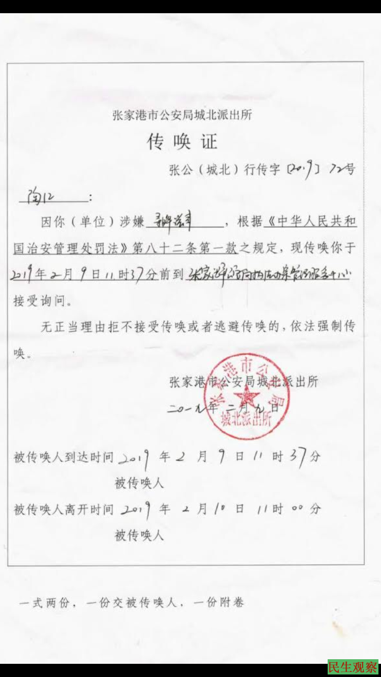 【民生观察2018年4月5日消息】今天,江苏张家港访民陶红向本网志愿者反映,2019年2月初她到北京上访,2019年2月8日晚,她被北京警察抓进府右街派出所非法拘禁,当晚她又被北京警方交由张家港警方截访返乡。2月下旬,陶红再次进京上访,2月27日她在北京南站附近再被警察截回,并以涉嫌“寻衅滋事”送至苏州第四看守所羁押一个月(刑拘),直到3月29日才被放出。获释后,陶红准备再进京上访,却遭到维稳人员的跟踪阻挠。