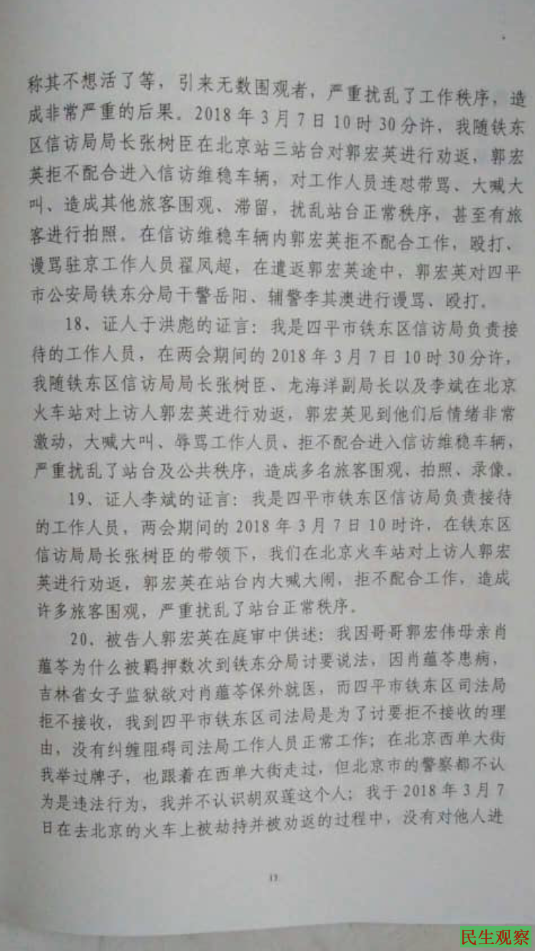 2018年3月,吉林四平公民郭洪英在北京最高法的安排接待的情况下到北京,最终被当局设局构陷,在北京住在出租屋等等最高法的接待日,正逢北京两会召开,被吉林四平当局在北京抓捕以妨碍公务罪,寻衅滋事罪两项罪名批捕现在关押吉林四平看守所。