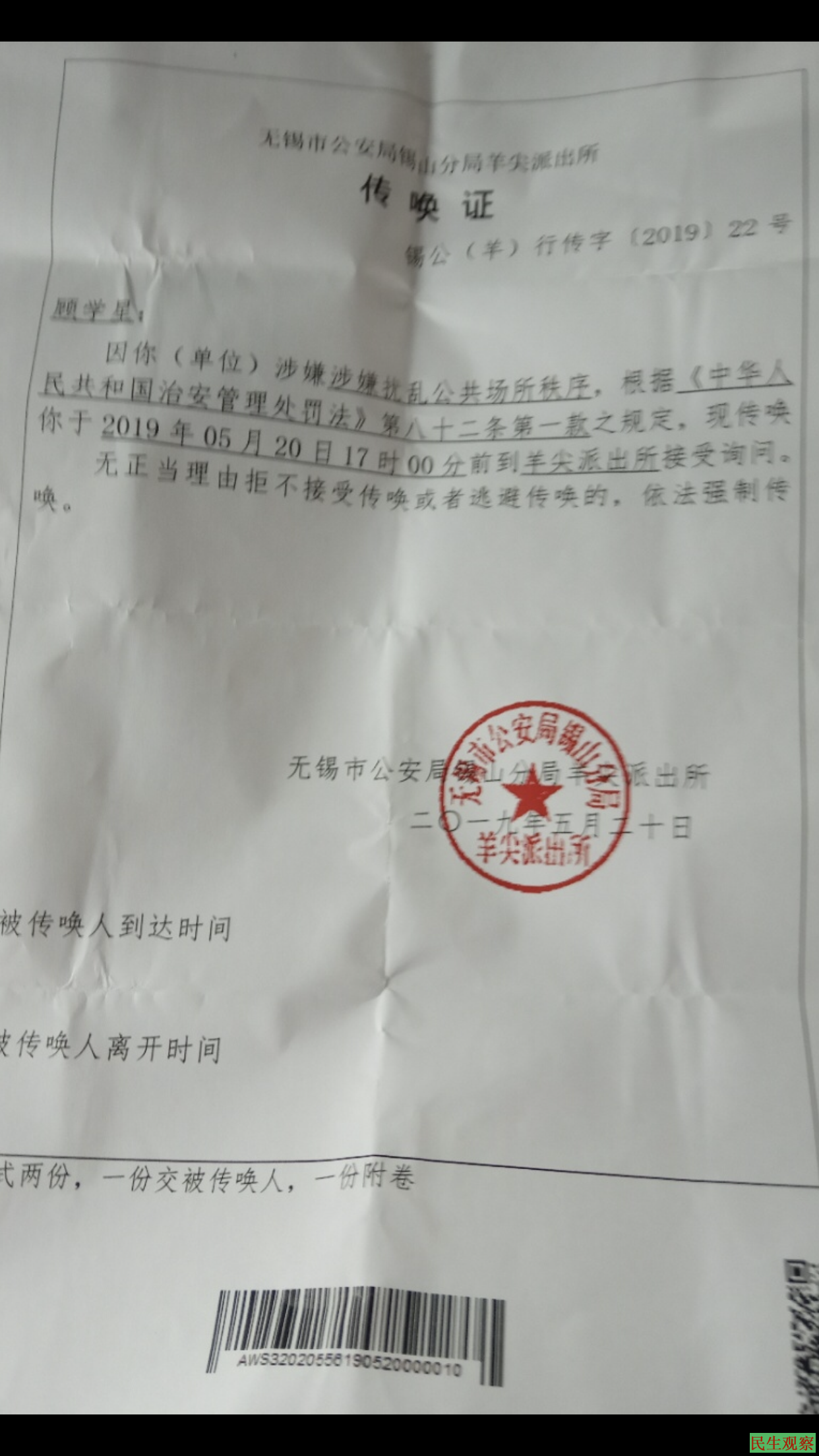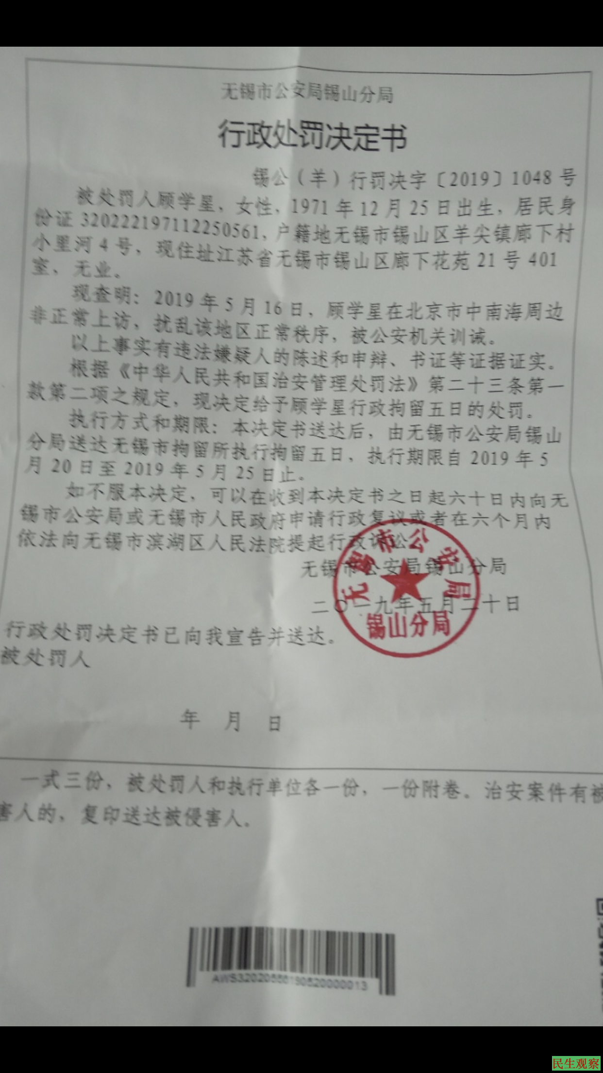 5月20日,无锡市公安局锡山分局羊尖派出所,以顾学星涉嫌扰乱公共场所秩序对其进行传唤。当天晚上,顾学星被以同样罪名行政拘留5天,被带往无锡市拘留所关押。