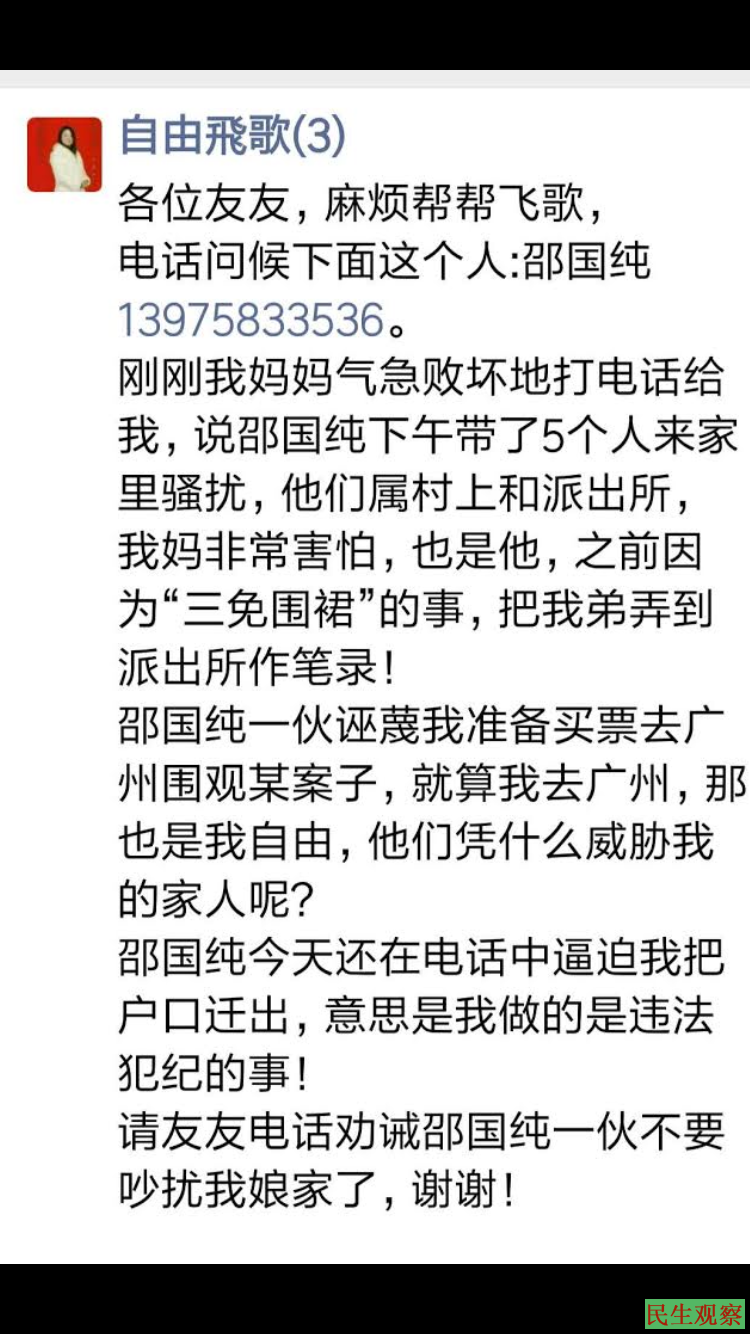 邵凤平反映:“5月29日,我妈妈气急败坏地打电话给我,说邵国纯下午带了5个人来家里骚扰,他们是村领导及派出所的警察,我妈非常害怕。邵国纯今天还在电话中逼迫我把户口迁出,意思是我做的是违法犯纪的事,留在本地会给他们警方增添麻烦。还有,邵国纯一伙诬蔑我准备买票去广州围观某人权案件,就算我去广州,那也是我的自由,他们凭什么威胁我的家人呢?这些警察因为我常年关注人权案件就经常骚扰、威胁我和家人,这个邵国纯之前就因为我声援“三免围裙”维权案件,就把我弟弟弄到派出所去作笔录,以警告我不要参与公民维权,否则我的家人也不得安身。所以,我想请各位网友,请大家帮帮我‘自由飞歌’(本名:邵凤平),电话问候一下面这个人,劝诫邵国纯一伙不要再骚扰、威胁我娘家人。邵国纯电话:13975833536。”