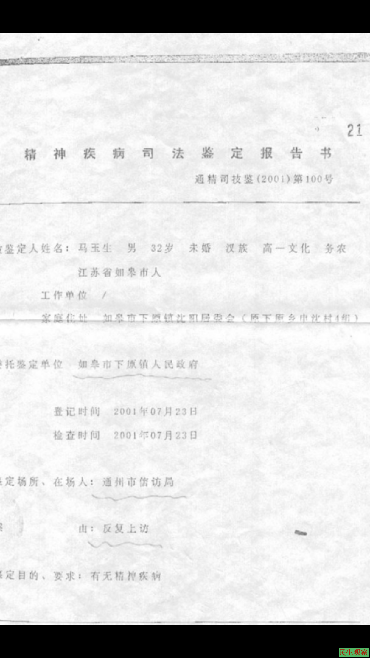 为了阻止我继续举报,一年后,也就是在2001年7月21日,如皋市信访局干部黄托、孙其德他们却把我从上访半路上给强行关押到下原镇派出所内(当时关了50多个小时)。在此期间,他们让时任下原镇人大副主任胡欣荣等干部跟我面谈,他们逼着我承认今后永远不再继续举报,否则是没有好下场的,并同时许诺给我好处,在遭到我严词拒绝的情况下,两天后,也就是在2001年7月23日,如皋市信访局干部徐锦梅等便将我带到“通州市信访局”(而不是司法鉴定机构)并无中生有、捏造事实,采用不法手段通过非法设立、根本就没有鉴定资格的南通市一家非法司法鉴定组织给我强行扣上了精神病人的帽子,也就是如皋市信访局以“下原镇人民政府”的名义,并以“反复上访”为由给我做了一份非法虚假精神病司法鉴定书。就这样,我无缘无故竟然在眨眼之间莫名其妙患上了神经病。紧随其后,我就于2001年8月8日开始并接二连三遭到了政府干部打击报复。