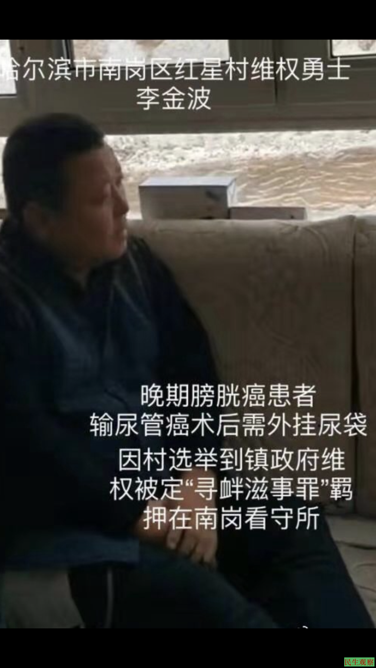 【民生观察2019年12月3日消息】黑龙江哈尔滨市南岗区红星村晚期癌症患者李金波,因村选举到镇政府维权被哈尔滨市公安局南岗分局以扰乱社会秩序罪刑拘,之后又变更罪名被以涉嫌寻衅滋事罪逮捕,现羁押于南岗区看守所。家属表示,因李金波是膀胱癌晚期患者以及同时还患有其它多种病症,需要长期服用中药以及定期复诊,生活上也难以自理,家人多次向有关部门申请取保,但至今杳无音信。