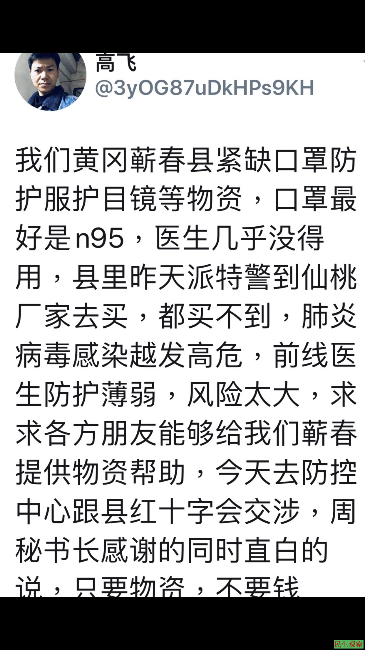 【民生观察2020年1月31日消息】本网获悉,日前,湖北黄冈蕲春籍维权人士高飞被警方拘留,疑因高度关注新型冠状病毒疫情以及上街免费派发口罩和防疫宣教有关,并声言监督政府,对当局此次疫情处置不力进行抨击。