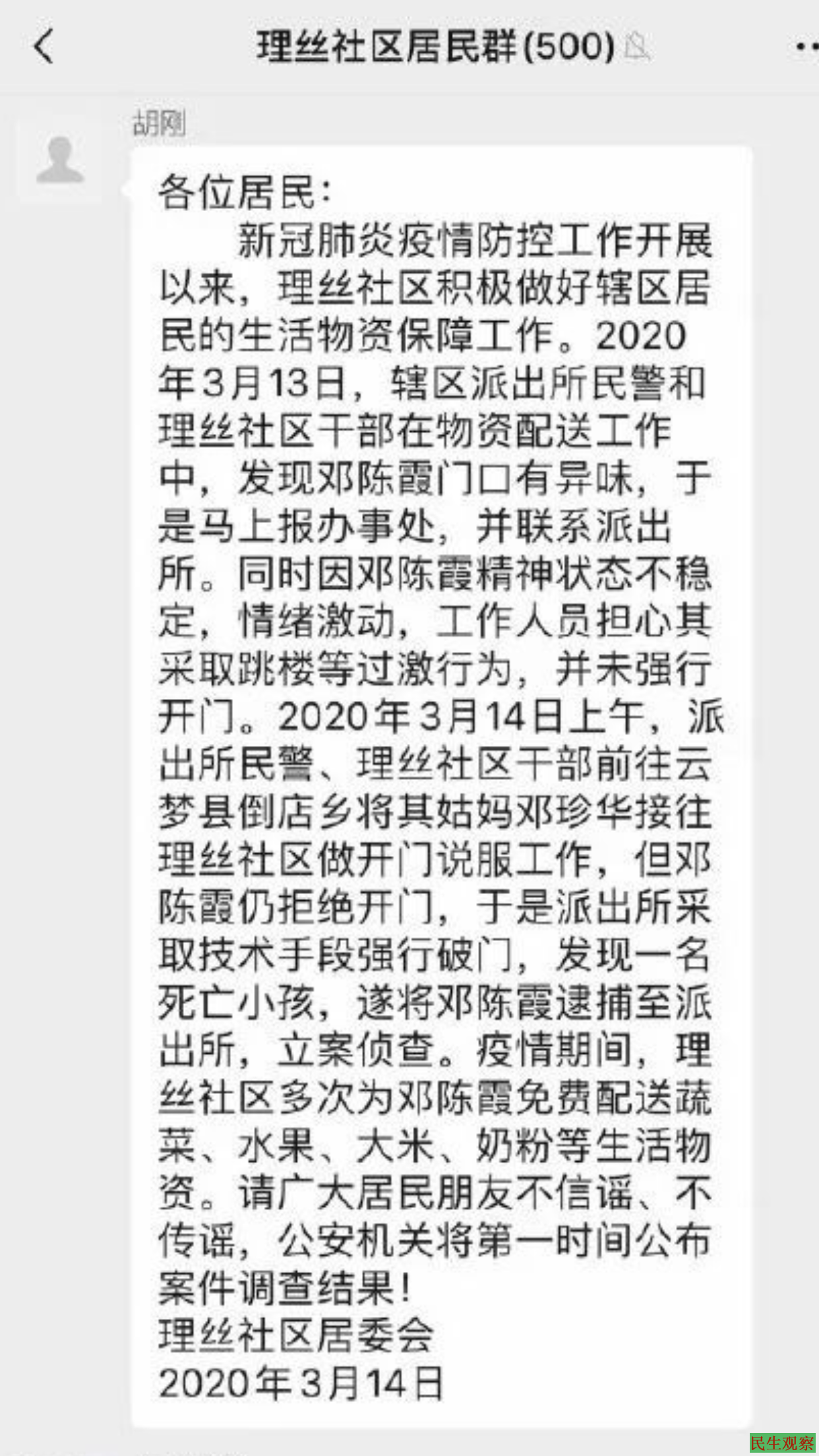 【民生观察2020年3月15日消息】本网获悉,2020年3月14日,湖北孝感市“里丝小区”一名不到2岁的幼童饿死在家中。孝感居民发帖称,孩子的父母已经离婚,孩子随母亲一起生活,母亲名叫邓陈霞(音),她精神有问题,孩子是饿死的,尸体已经发臭,警方到场后叫来了殡葬人员将尸体拖走。